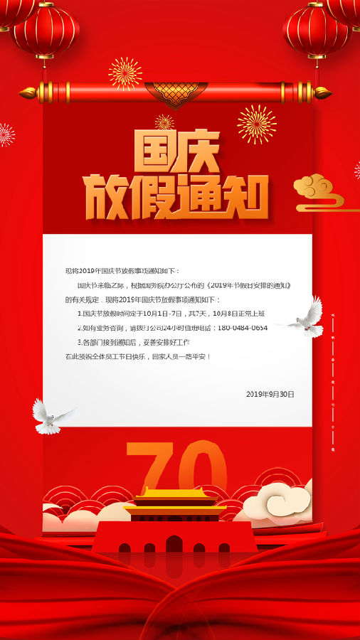 國(guó)慶節(jié)將至,根據(jù)2019年國(guó)慶放假時(shí)間安排,并結(jié)合我公司具體情況決定,現(xiàn)將2019年國(guó)慶節(jié)放假事項(xiàng)通知如下: