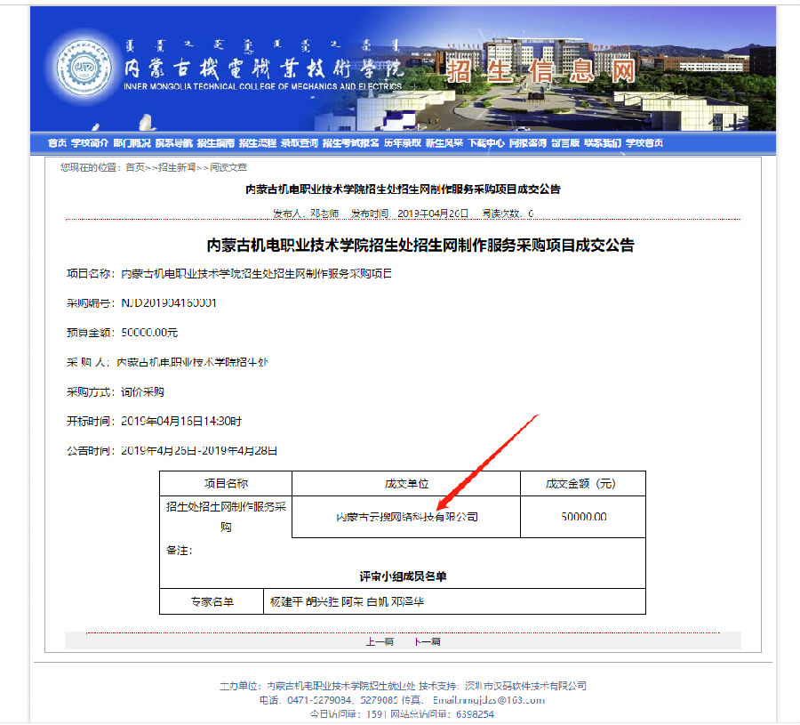 我公司經(jīng)過機(jī)電學(xué)院評審專家的層層選拔,中標(biāo)內(nèi)蒙古機(jī)電職業(yè)技術(shù)學(xué)院招生處網(wǎng)站建設(shè)項目!
